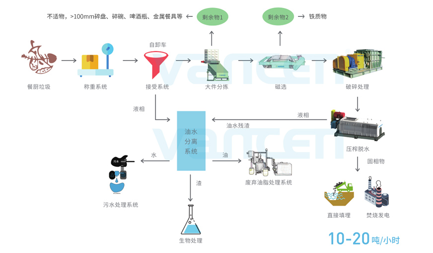 餐廚垃圾是食物垃圾中最主要的一-種,包括家庭、食品加工、飲食服務、單位供餐等活動中產(chǎn)生的食物加工下腳料(餐廚垃圾)、食用殘余(泔腳)和廢棄食用油脂。餐廚垃圾分為三部分:油、水和餐飲產(chǎn)生的固體廢棄物。油水分離是餐廚垃圾處理中常見的預處理步驟。餐廚垃圾固體廢棄物除了油和水,本身鹽、鈣、蛋白質(zhì)、磷、氮、淀粉含量高,富含有機質(zhì)和微量元素,可利用空間廣,可加工成天然有機肥,制成生物飼料,或用于焚燒發(fā)電、發(fā)酵制氫、沼氣生產(chǎn)、熱解生產(chǎn)燃氣等多種用途。